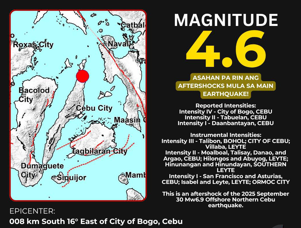 BOGO CITY, Philippines — A magnitude 4.6 aftershock struck the central Philippine island of Cebu late Friday, rattling communities still recovering from a stronger quake last month and prompting warnings of additional tremors.
